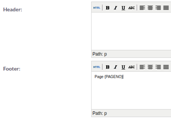 Within the PDF Templates Edit View, you can also define a Header and a Footer for your templates. These can be completed using the Header and Footer text areas found below the Body text area.