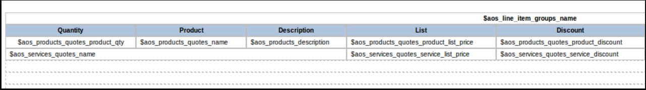 When using a sample to create a template for Quotes or Invoices the Line Items are formatted within a table. You can change the fields found in this table as well as add or remove columns. Please note that if you are creating the template from scratch you must format the Line Items section as a table.