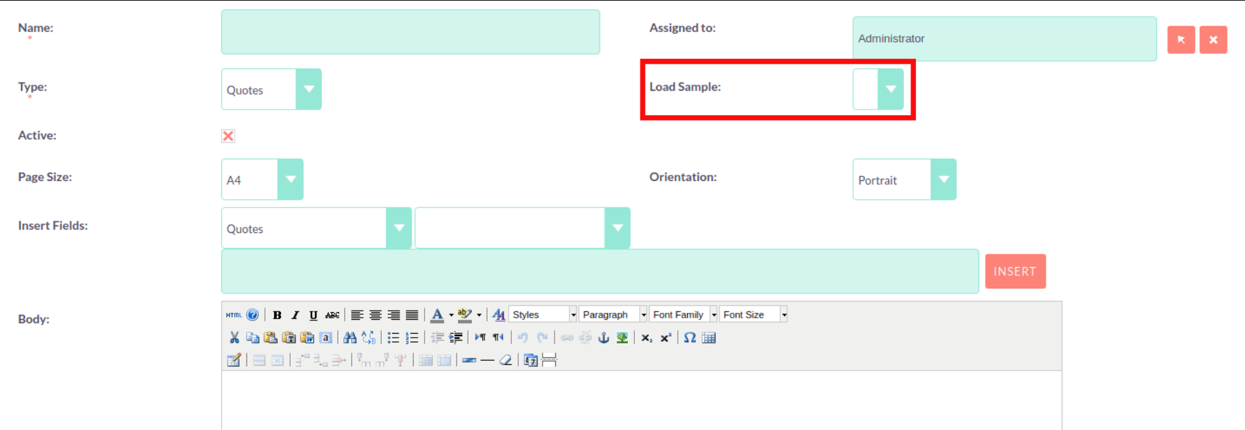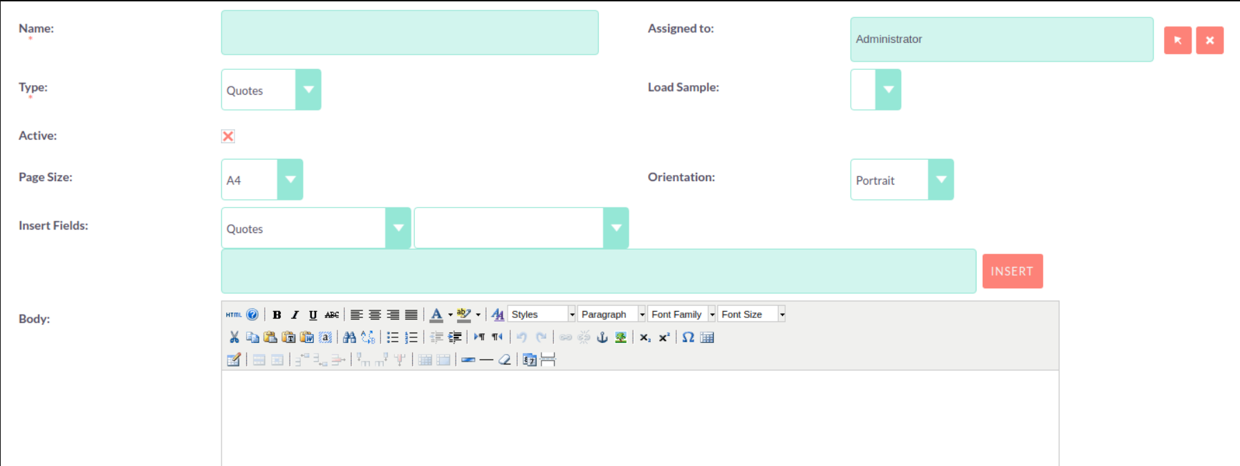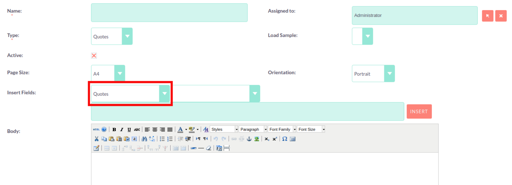 This will populate the second drop down with all the fields found within that module. Once you have selected the field you wish to insert, the text field will populate with the field variable name. Click ‘Insert’ to place this field into the Body of the template. If the Active check box is selected then users will be able to generate PDFs from this template. If it is not selected you will not.