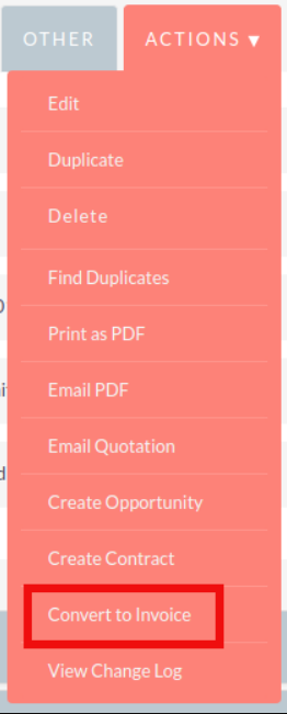 With AOS you can convert Quotes to Invoices. This can be achieved by clicking the ‘Convert to Invoice’ button on the Quote Detail View.