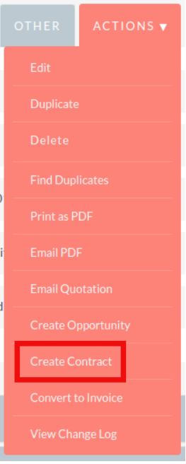 As well as converting to an Invoice, AOS allows users to create a Contract based on a Quote. This can be done by clicking the ‘Create Contract’ button on the Quote Detail View.