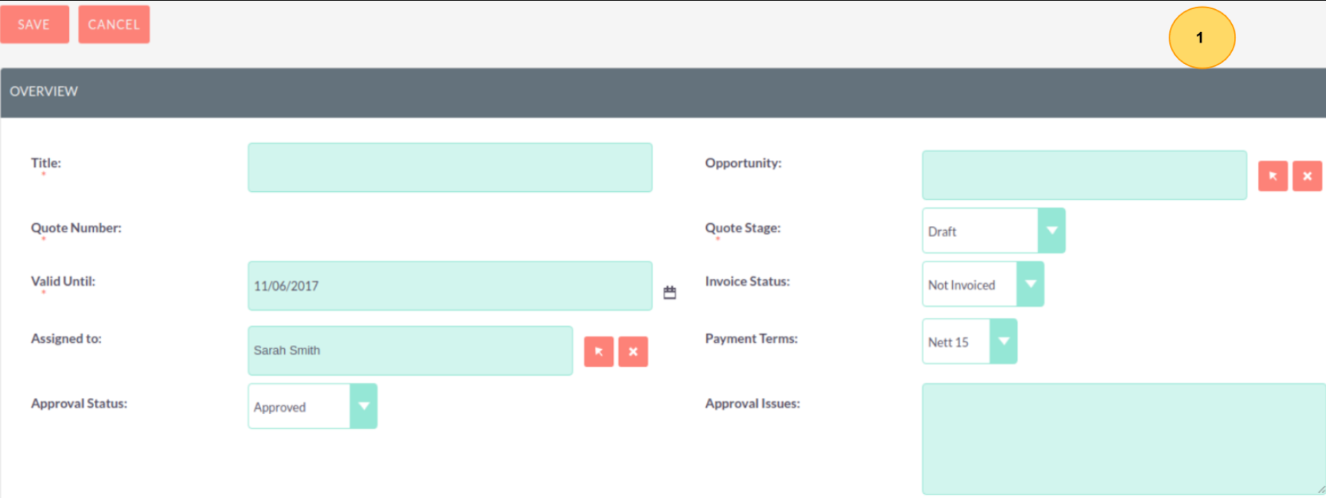 The Shipping field allows you to add a shipping cost. The Shipping Tax field allows you to add tax to this value. Once the Quote has been compiled, click ‘Save’ to save the Quote.