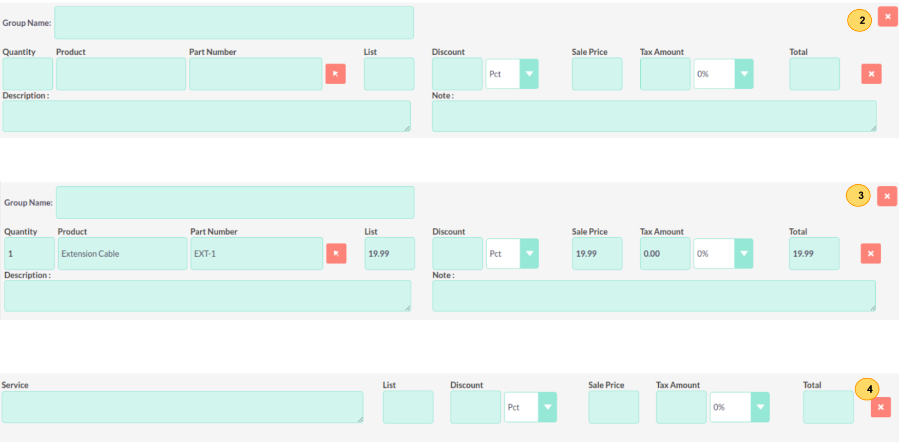 This will display the Group, allowing you to insert a Group Name and add a Product Line or Service Line. It will also display the Group Totals.